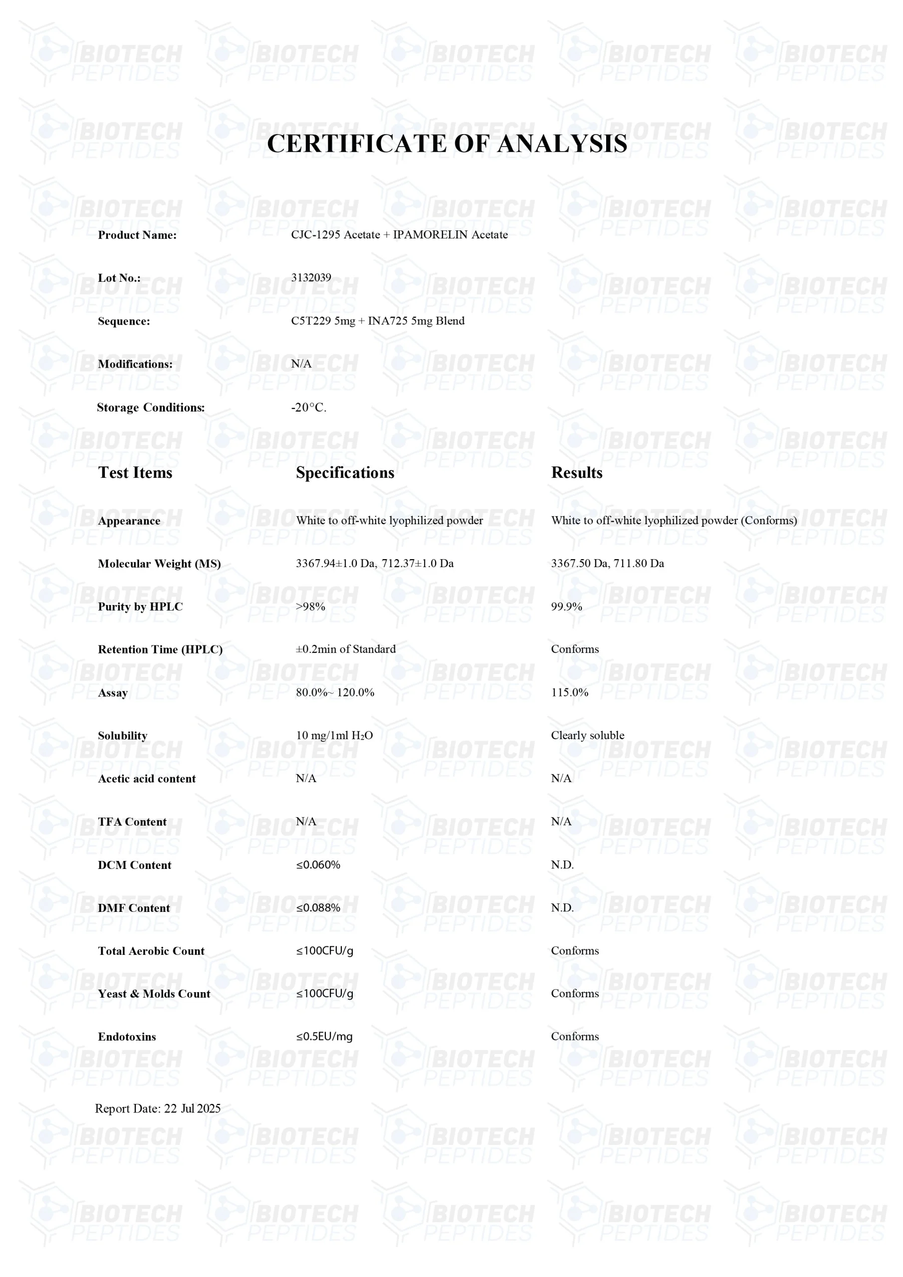 This product is strictly for research/laboratory use only. Human or animal use and/or consumption is strictly prohibited by law. Only qualified and licensed professionals should handle these products. Any information found on Biotech Peptides is strictly for educational purposes only. Refer to our terms and conditions for more details.