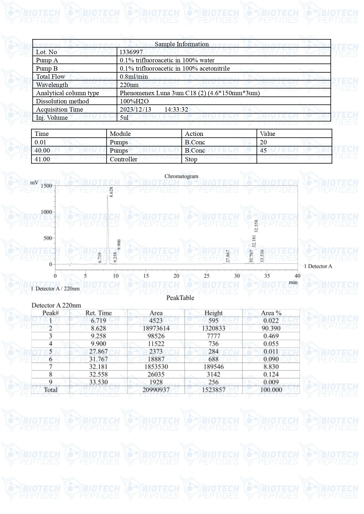 This product is strictly for research/laboratory use only. Human or animal use and/or consumption is strictly prohibited by law. Only qualified and licensed professionals should handle these products. Any information found on Biotech Peptides is strictly for educational purposes only. Refer to our terms and conditions for more details.