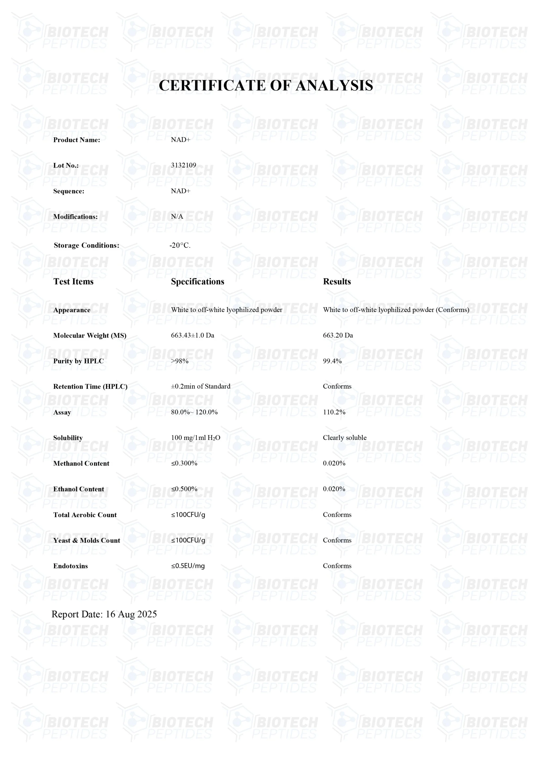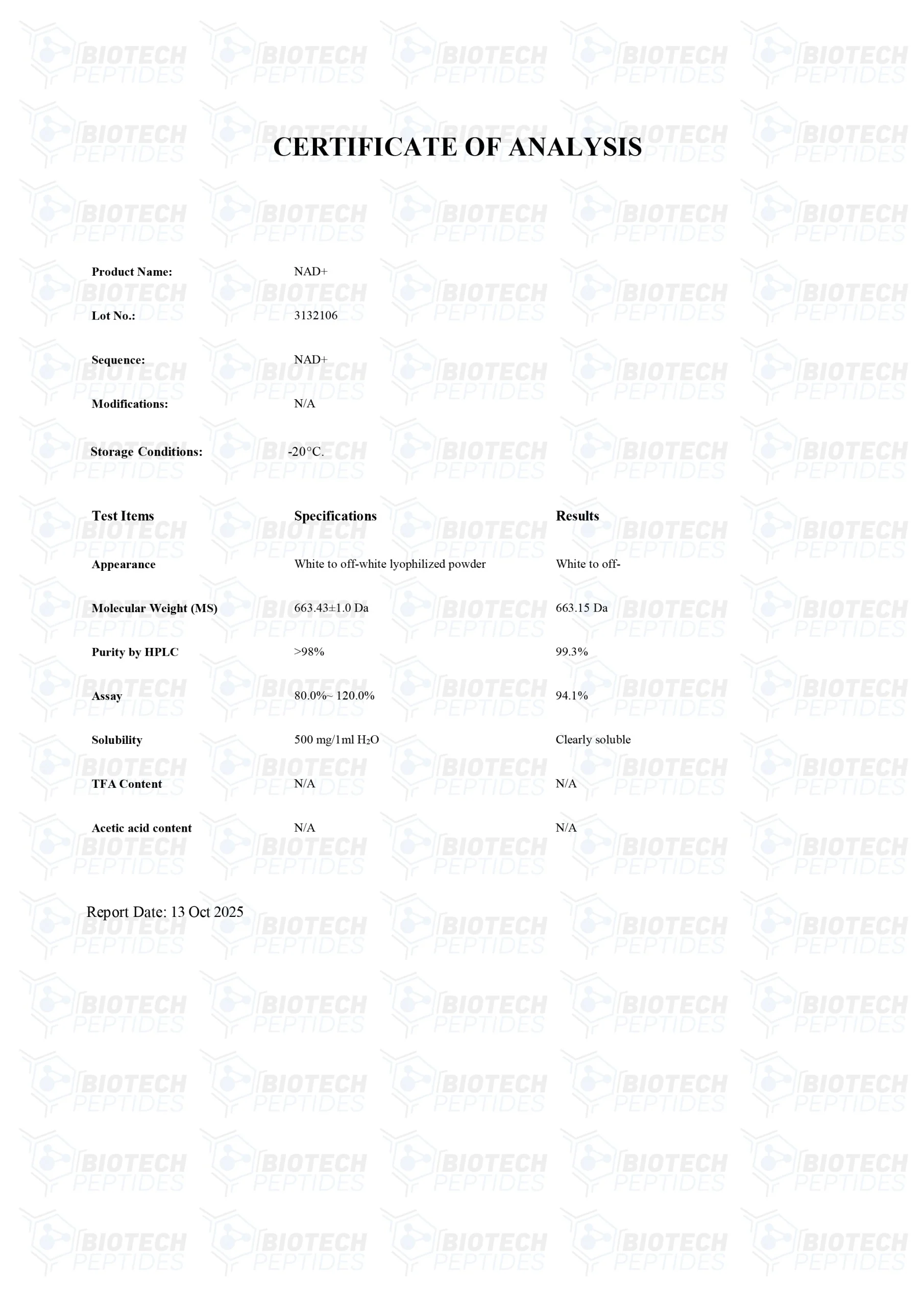 Nicotinamide Adenine Dinucleotide (NAD+) is an oxidized form of NADH (Nicotinamide Adenine Dinucleotide Hydroxide). NAD+ is a component of the Electron Transport Chain (ETC), which researchers have suggested to act in carrying electrons and thus energy within cells. The peptide has also been posited to potentially act as a mediator for various physiological processes, such as post-translational modification of the proteins and activation/deactivation of some enzymes. It is believed to be a critical component in maintaining cell-to-cell communication.