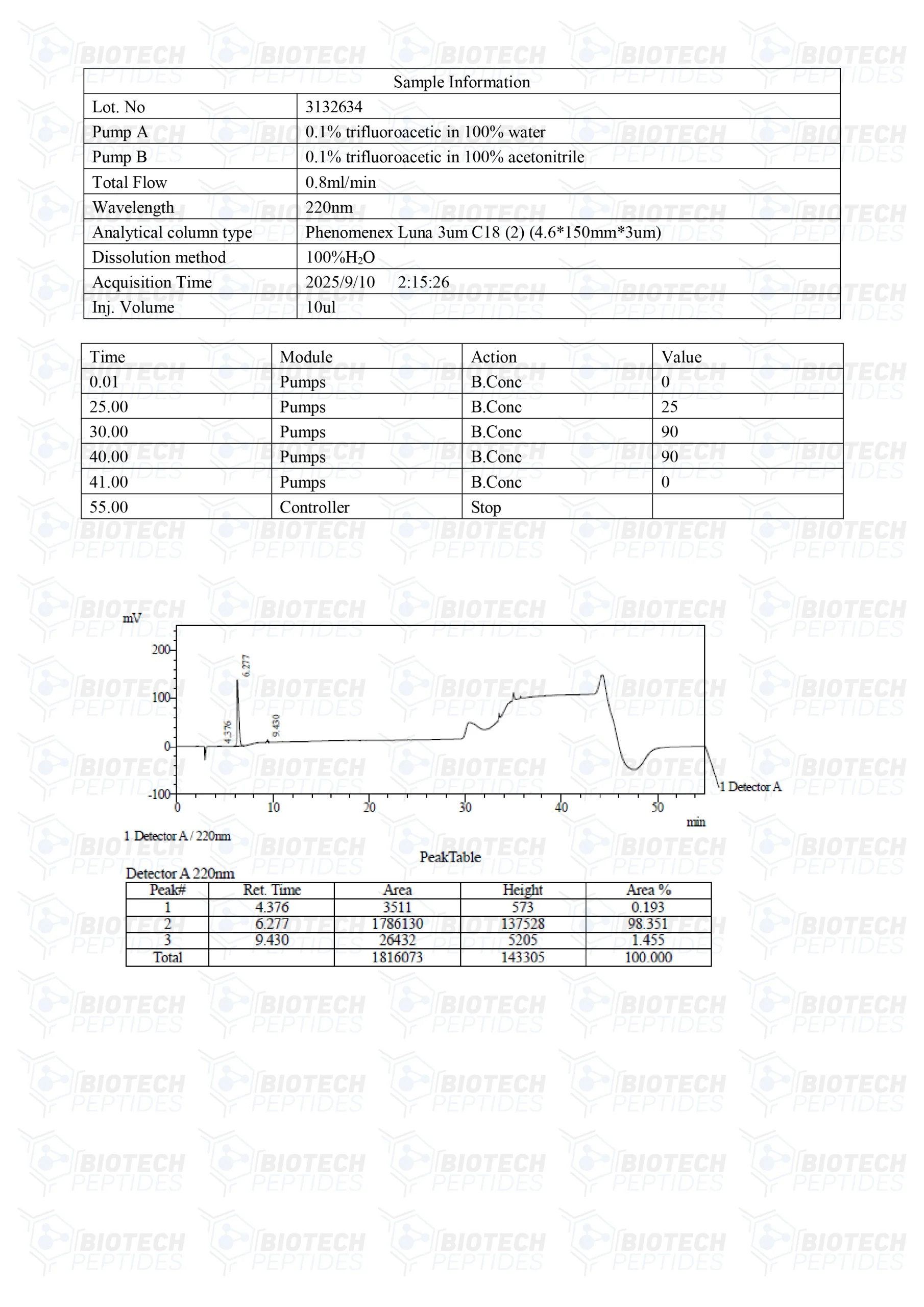 This product is strictly for research/laboratory use only. Human or animal use and/or consumption is strictly prohibited by law. Only qualified and licensed professionals should handle these products. Any information found on Biotech Peptides is strictly for educational purposes only. Refer to our terms and conditions for more details.