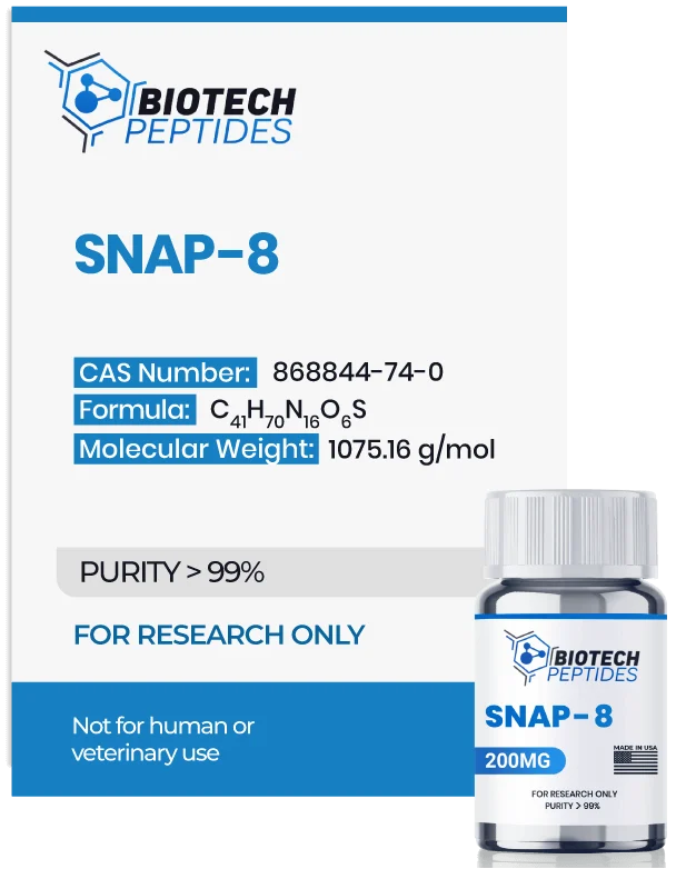 SNAP-8, or Synaptosomal-associated protein 8, is a synthetic octapeptide believed to mimic certain functionalities of its larger counterpart, SNAP-25, a protein deemed integral to neurotransmitter release and muscle contraction.[1] Constructed from eight amino acids, SNAP-8’s structure is designed with specific modifications: an acetylated N-terminus and an amidated C-terminus, culminating in the sequence Ac-Glu-Glu-Met-Gln-Arg-Arg-Ala-Asp-NH2. It is structurally similar to another peptide known as acetyl hexapeptide-3, which also reportedly mimics a fragment of SNAP-25 and inhibits its function, leading to similar anti-wrinkle potential. By adding two amino acids to the chain of acetyl hexapeptide-3, the resultant acetyl octapeptide further enriches the field of research compounds studying cell aging and skin cell rejuvenation.[2]